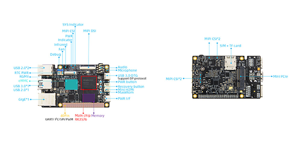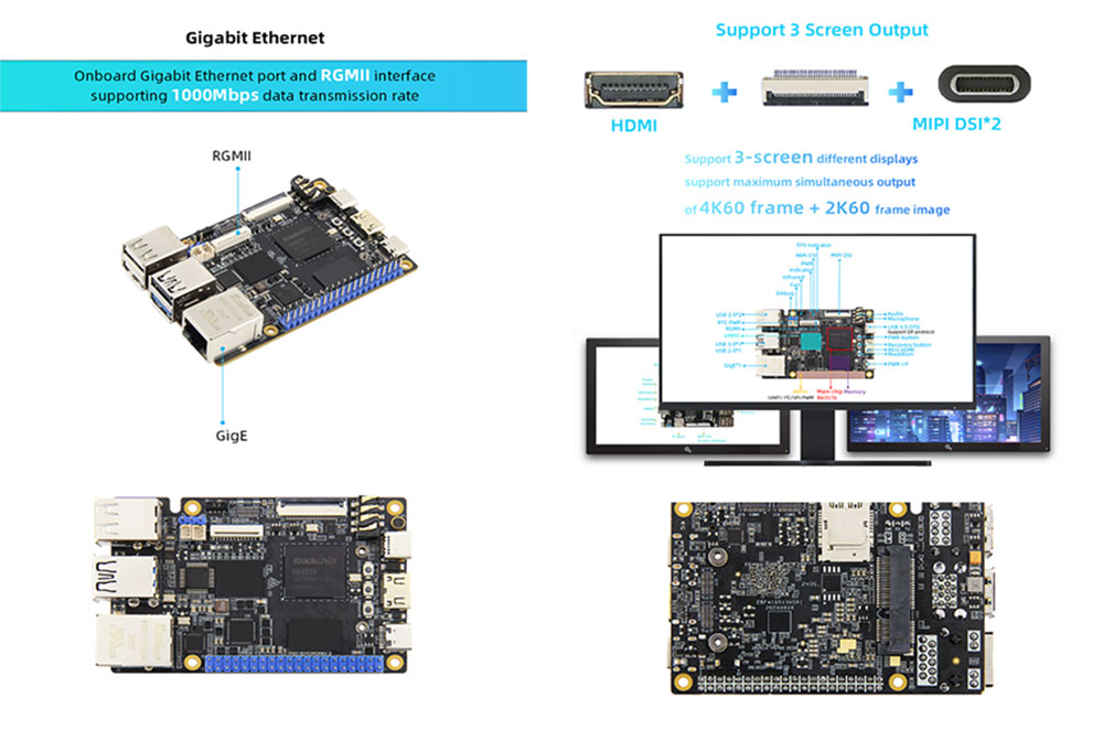 4. พอร์ต Onboard Gigabit Ethernet, RGMII, USB3.0/2.0, MINI PCLE, MINI HDMI, MIPI Screen และกล้อง MIPI และส่วนต่อพ่วงอื่น ๆ
