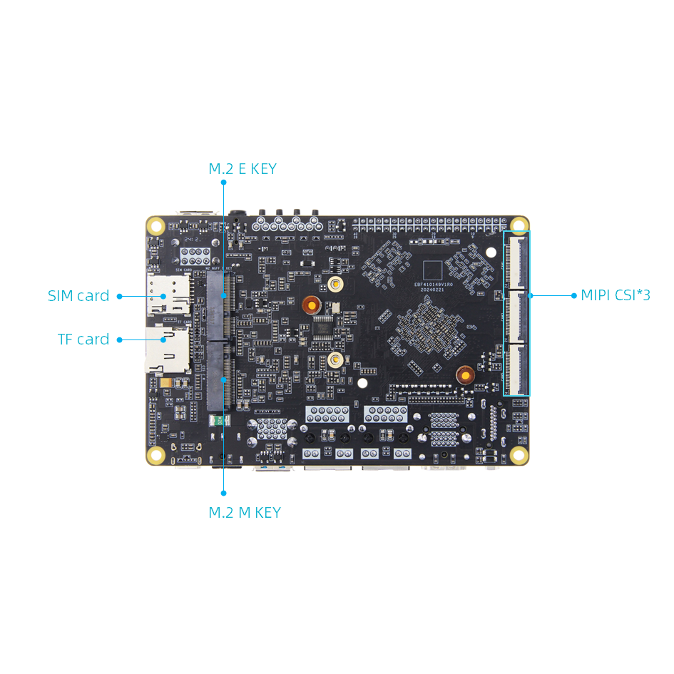 • การกำหนดค่าหลัก: 16GB LPDDR5 RAM + 128GB eMMC, อินเทอร์เฟซกล้อง MIPI CSI 6 แชนเนล, อินเทอร์เฟซ MIPI-CSI 4 แชนเนล + เอาต์พุต HDMI 2.1, โมดูลการเข้ารหัสวิดีโอฮาร์ดแวร์ในตัว